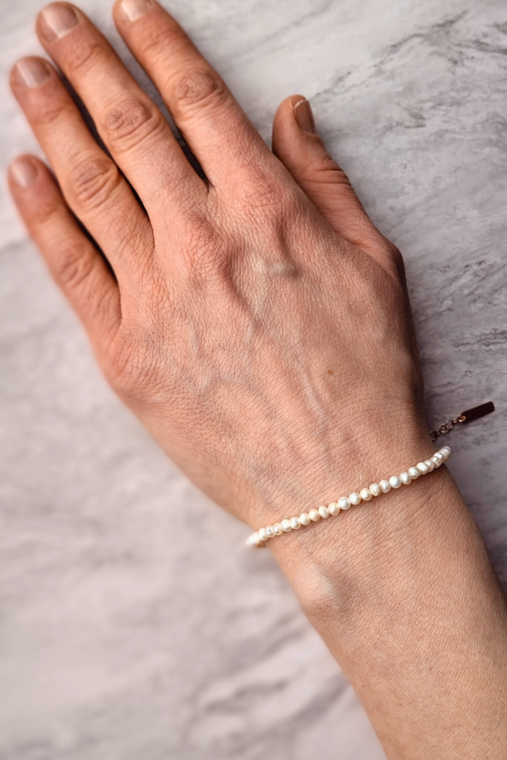 Armband aus 925 Sterling Silber mit Goldplattierung und Süßwasserperlen in mattem Off-White. Klassischer Perlen-Stil trifft auf Verspieltheit und Modernität dank der barocken Form der Mini-Perlen.