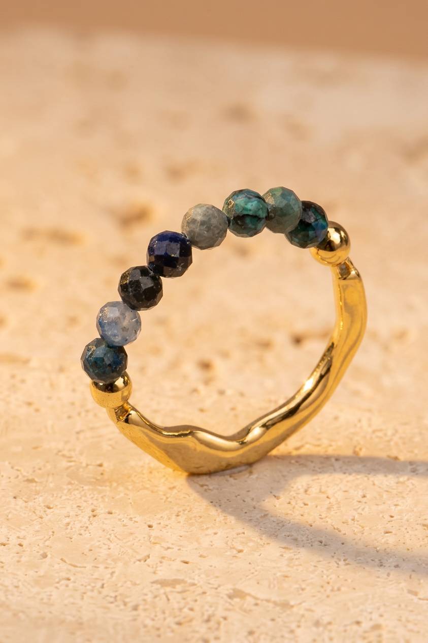 Chrysocolla Ring aus vergoldetem Messing mit einer halben Reihe facettiert geschliffener Chrysocolla-Perlen. Goldene Schiene mit organisch-gewellter Form. Flexible Passform durch Gummizug. Tiefe Grüntöne für Eleganz und Naturverbundenheit.