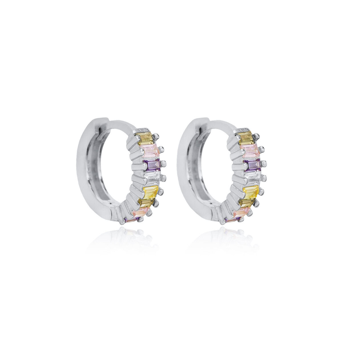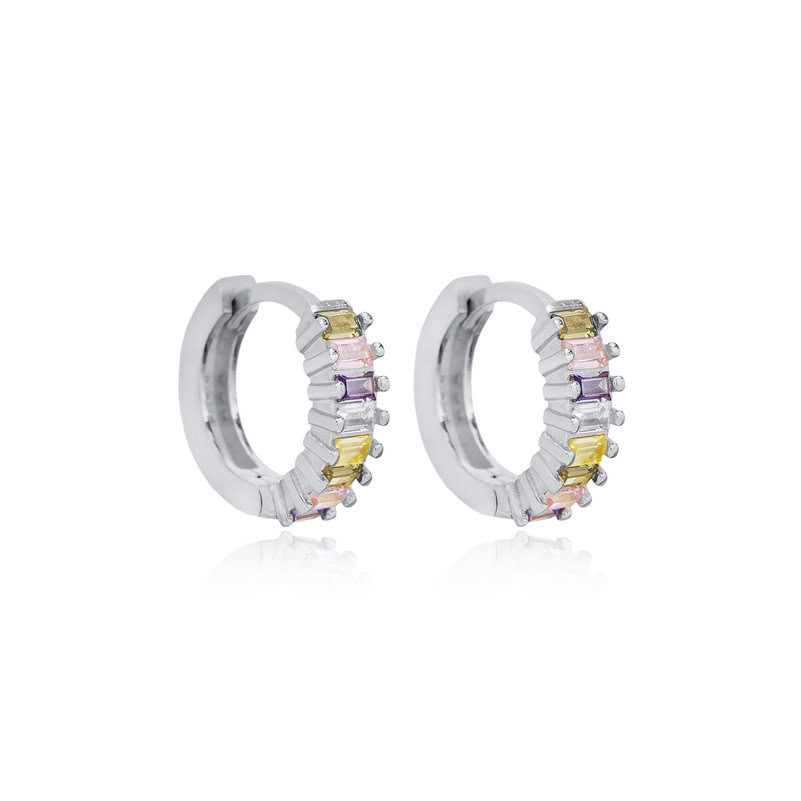 Kleine Creolen aus 925 Sterlingsilber mit bunten, pastellfarbenen Zirkonia in Baguette-Schliff.