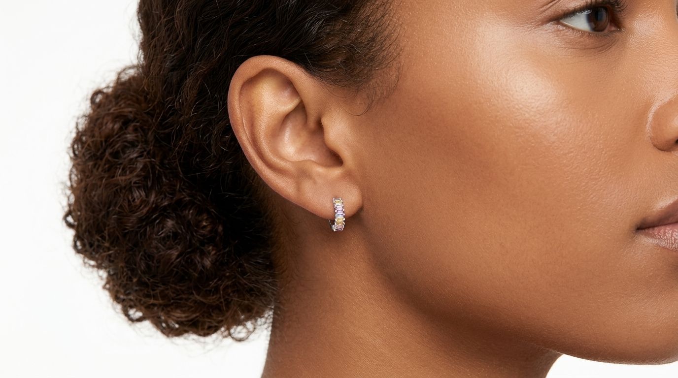 Baguette-Schliff mit Pastell-Farben-Peps. Creolen, die monochrome Outfits aufwerten oder Akzente farbenfroher Looks spiegeln.