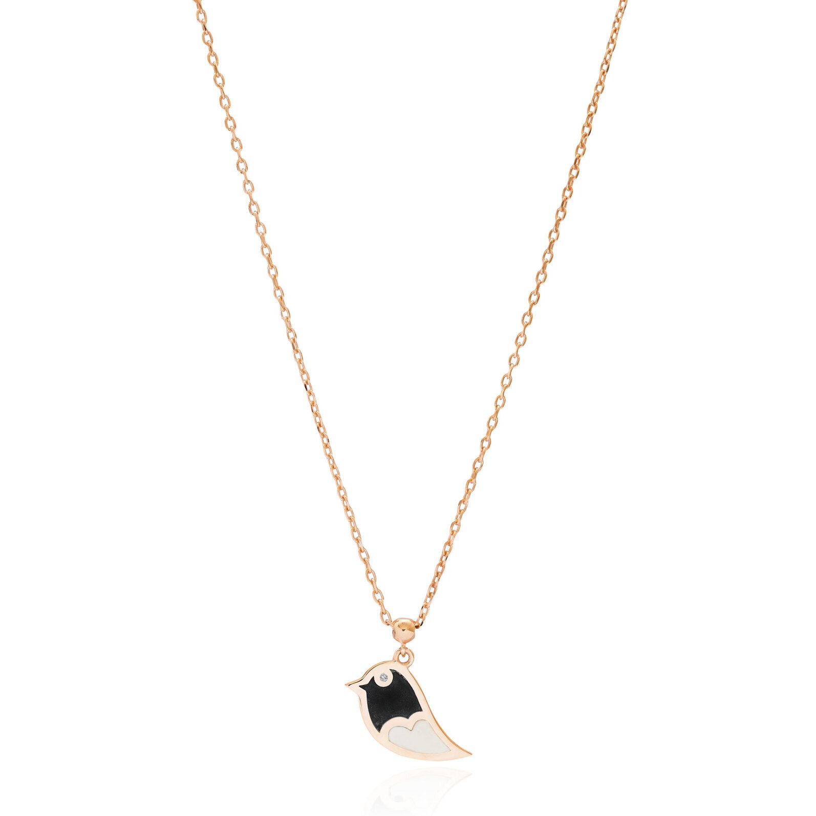 Kette mit Vogelanhänger im schwarz-weißen Emaille. Ein wertvolles, ruhiges Design.
