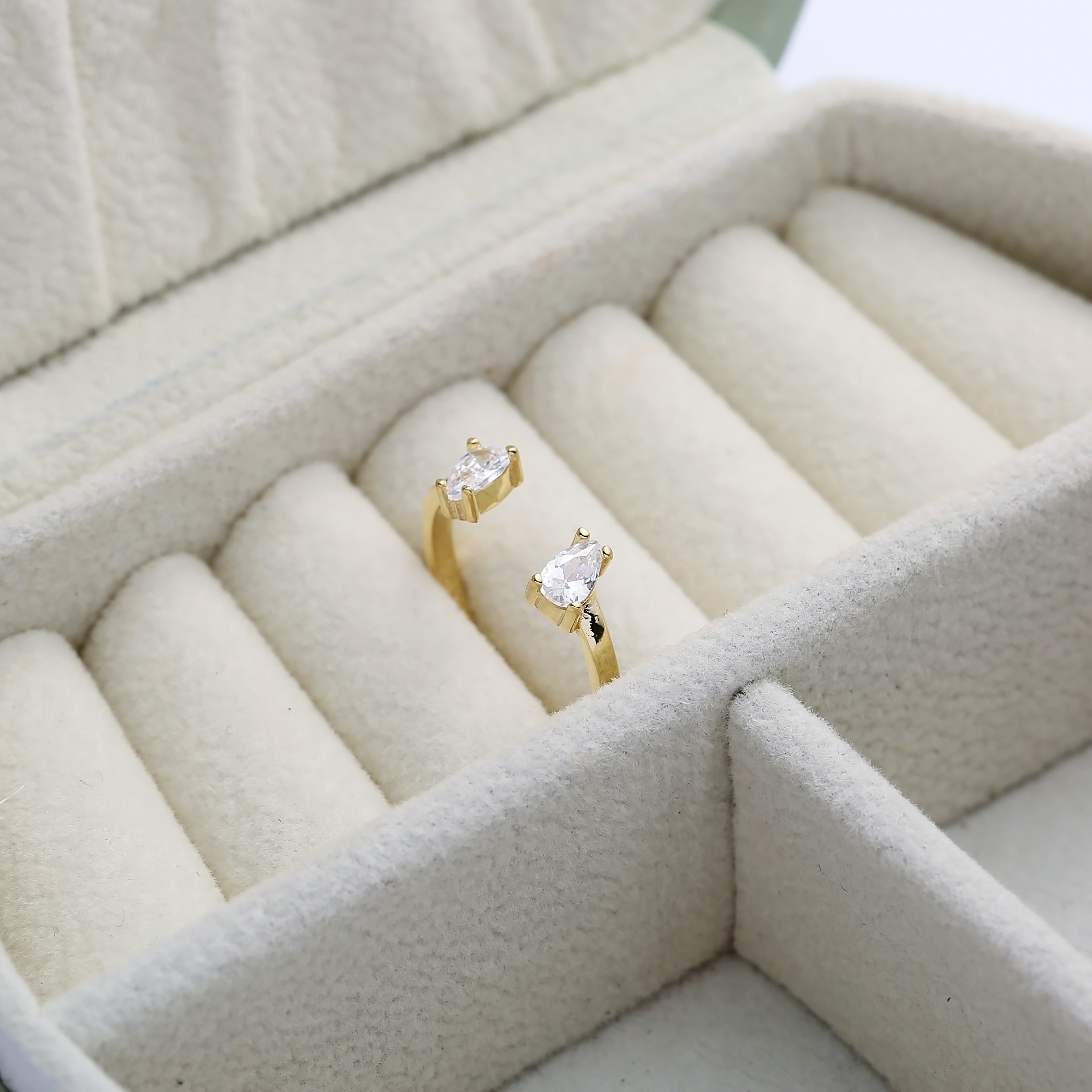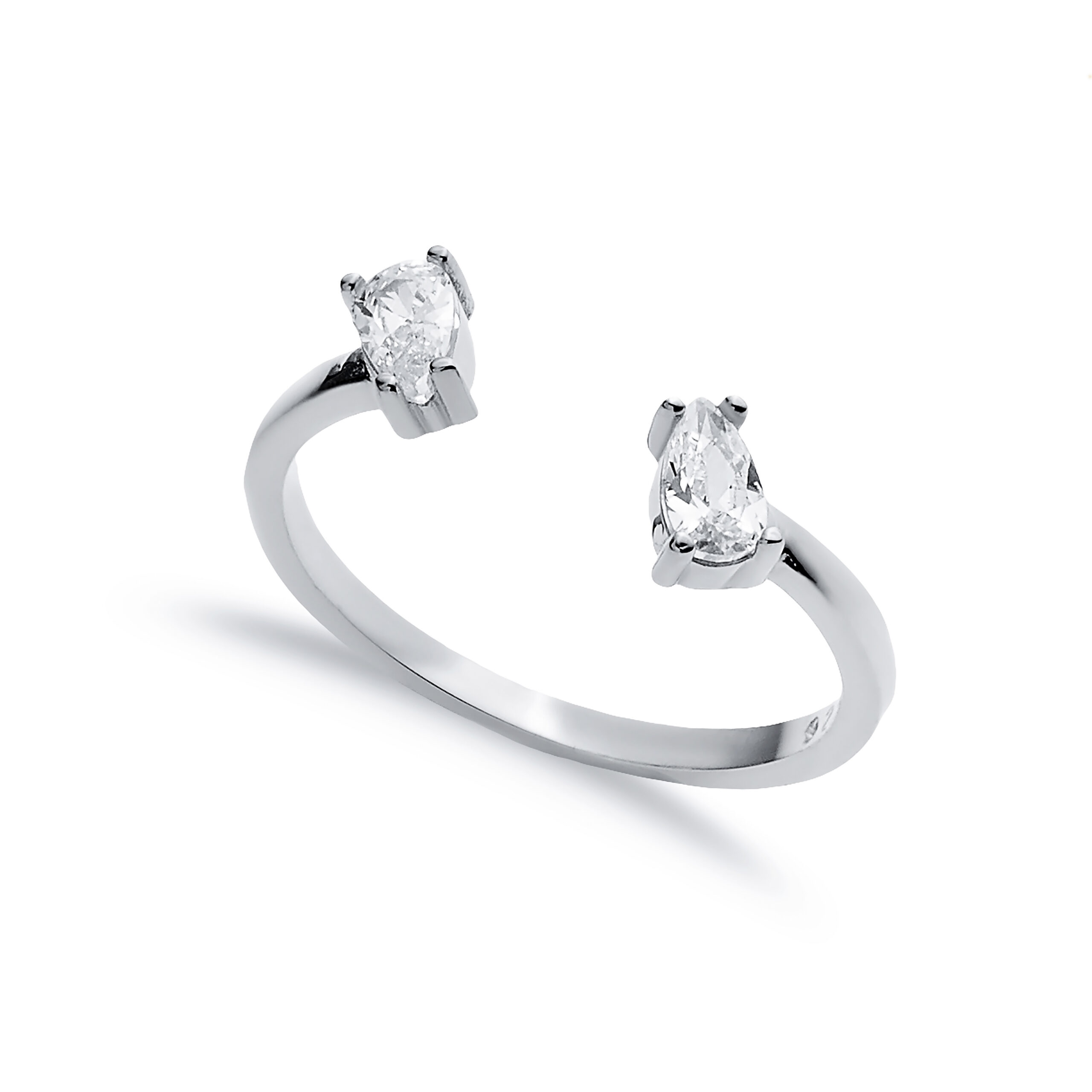 Ring aus 925 Sterlingsilber mit zwei tropfenförmigen Zirkonia-Steinen. Offenes Design, größenverstellbar. Erhältlich in Silber (rhodiniert). Nickelfrei.