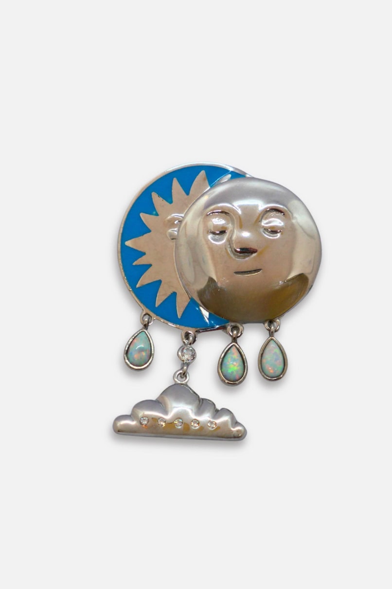 Diese handgefertigte Silberbrosche mit Opalen zeigt eine Sonnenfinsternis und symbolisiert jene besondere Momente im Leben, in denen alles in perfekter Harmonie zusammenkommt und plötzlich Sinn macht.