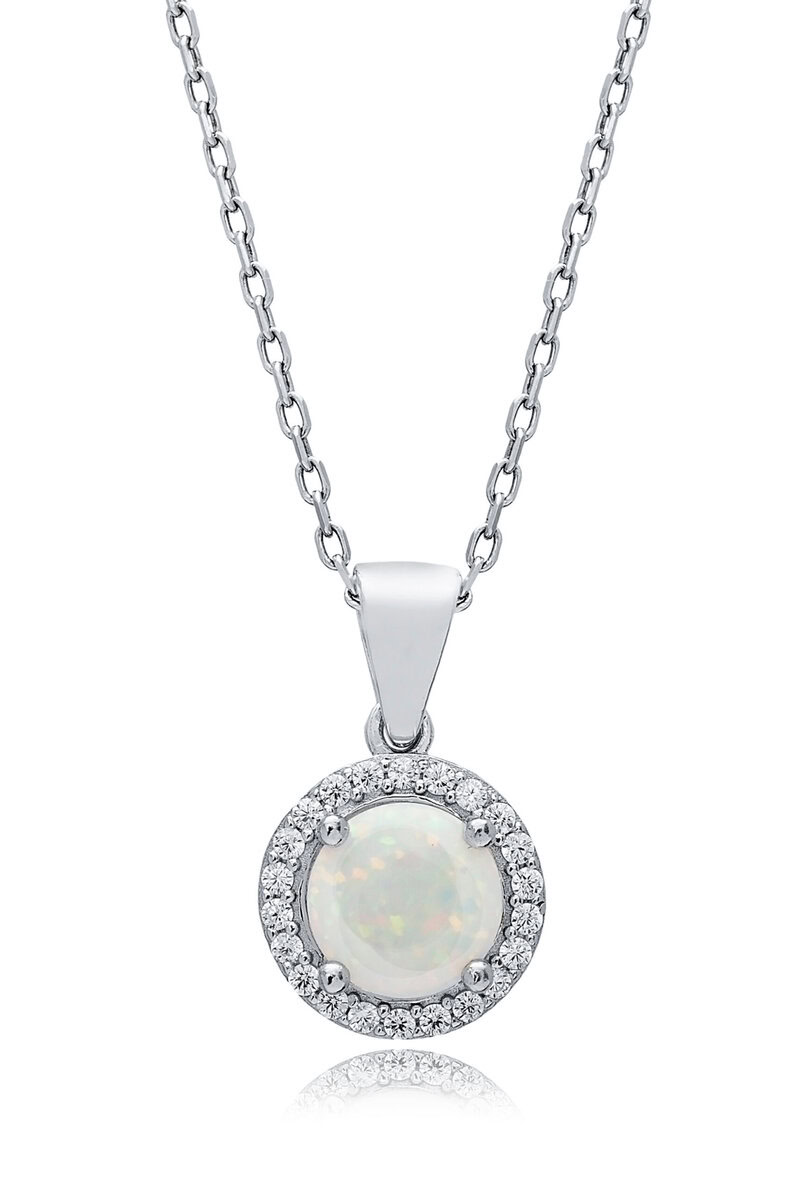 Kette aus 925 Sterlingsilber mit rundem Anhänger aus synthetischem Opal und Zirkonia. Rhodinierte Oberfläche für weißgoldähnlichen Glanz und Haltbarkeit. Geschenkfertig geliefert. Nickelfrei.
